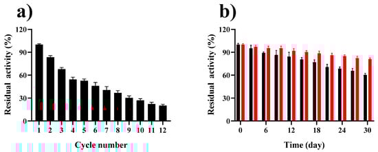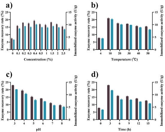 To determine the optimum reaction time for immobilization, we measured the enzyme recovery rate and activity of the immobilized enzymes at reaction times of 3, 6, 9, 12, 15, and 18 h. As shown in Figure 4b, when the reaction time was 9 h, enzyme activity and activity recovery reached their highest values (13.1 U/g and 23.7%, respectively). Enzyme activity and activity recovery gradually decreased with increasing immobilization time possibly due to the saturation of the reactive groups on the carrier, excessive physisorption, and the enzyme’s spatial resistance [].