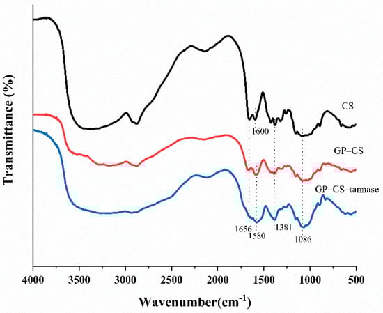 FTIR analysis of the CS, GP–CS, and GP–CS–tannase.