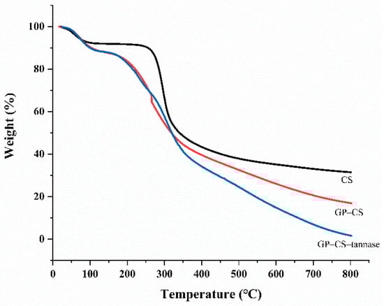 CS, GP–CS, and GP–CS–tannase were completely dried through vacuum freezing and used for FT-IR and TGA analysis. The samples were ground with KBr (1:100 ratio) in a mortar and pestle for 3–4 min and then made into flakes with a hydraulic press. Infrared spectral data were collected with an FTIR spectrometer (Thermo Fisher Nicolet, iS10, Waltham, MA, USA) in a range of 4000–400 cm−1 with 16-scan interferogram at 4 cm−1 resolution.