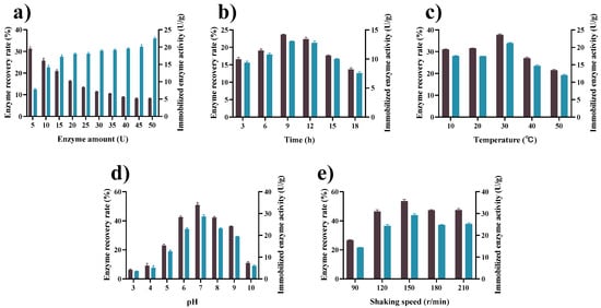 Effects of (a) enzyme amount (5–50 U), (b) immobilization time (3–18 h), (c) immobilization temperature (10–50 °C), (d) immobilization pH (Citrate buffer at pH 3.0–6.0, phosphate at pH 6.0–8.0, Tris-HCl buffer at pH 8.0–9.0, and Gly-NaOH buffer at pH 9.0–10.0), and (e) shaking speed (90–210 rpm/min) on the enzyme recovery rate (■) of immobilized tannase and the enzyme activity (■). Other immobilization conditions were carried out as in Section 3.3. The activity of immobilized enzyme was determined under standard conditions (30 °C, citrate buffer at pH 5.0). All data represent the mean ± standard deviation of triplicate measurements.