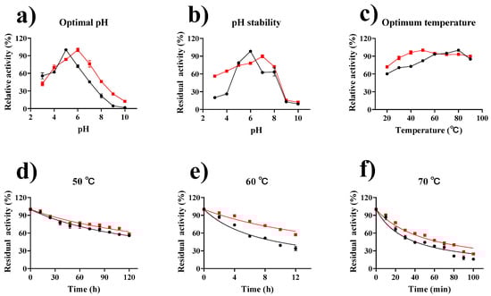 ). (a) The optimal pH For Tannase was determined by performing an activity assay with four different buffers (50 mM) at pH 3.0–10.0, citrate buffer at pH 3.0–6.0, phosphate at pH 6.0–8.0, Tris-HCl buffer at pH 8.0–9.0, and Gly-NaOH buffer at pH 9.0–10.0. (b) The pH stability of Tannase was determined during incubation at different pH values and 4 °C for 24 h. (c) The determination of the optimum temperatures for free and immobilized tannase at different temperatures and at pH 5.0 and 6.0. (d–f) The thermal stability of free and immobilized tannase was determined after incubation at 50 °C, 60 °C, and 70 °C. The half-life was obtained by fitting with GraphPad Prism software. All data represent the mean ± standard deviation of triplicate measurements.