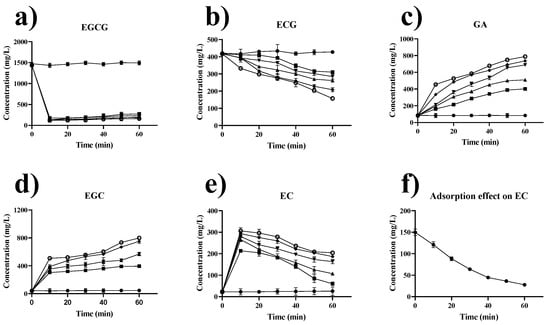 Effect of extraction temperature and time on catechins in green tea. (a) EGCG, (b) ECG, (c) GA, (d) EGC, (e) EC, and (f) adsorption effect on EC. The legend in Figure (a–e) is as follows: untreated tea extract (●), 30 °C (■), 40 °C (▲), 50 °C (▼), 60 °C (◆), and 70 °C (○); 0.5 g of GP–CS–tannase was added to 10 mL of tea extract, and enzyme activity was 12.5 U. All data represent the mean ± standard deviation of triplicate measurements.