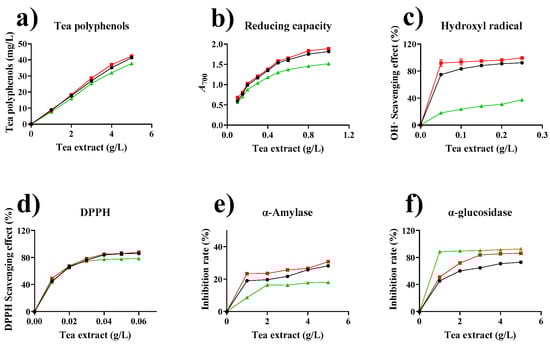 Effect of tannase treatment on the biological activities of tea extract. (a) Tea polyphenols. (b) Reducing capacity. (c) Hydroxyl radical-scavenging effect. (d) DPPH·-scavenging effect. (e) Inhibition rate of α-amylase. (f) Inhibition rate of α-glucosidase. (●), (■), and (▲), represent tannase-treated, GP–CS–tannase-treated, and untreated tea extracts, respectively. All data represent the mean ± standard deviation of triplicate measurements.