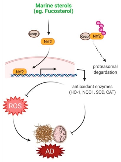 Effects of marine sterols on oxidative stress. Various sterols including fucosterol have been reported to activate Nrf2 signaling, which upregulates expression of various antioxidant enzymes, such as HO-1, NQO1, SOD and CAT. These enzymes inhibit ROS production and thereby may attenuate oxidative stress in AD pathology.