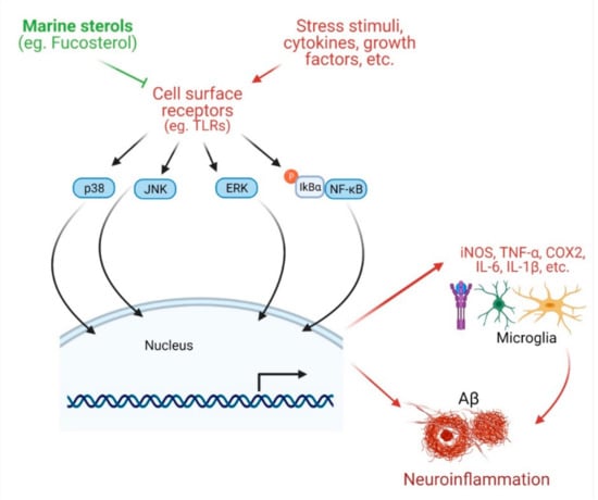 Effects of marine sterols on inflammation. Various stress stimuli, growth factors, and cytokines bind with diversified cell surface receptors (such as TLRs) and mediate different downstream signaling pathways, such as p38 MAPK, JNK, ERK, and NF-κB. These enter into the nucleus for transcription of various pro-inflammatory cytokines, including iNOS, TNFα, COX2, IL-6, and IL1β. All of these ultimately help in the formation of Aβ plaque in brain. Various sterols including fucosterol have been reported to disturb the cell surface receptors as well as major signaling systems leading to inhibition of inflammatory response.