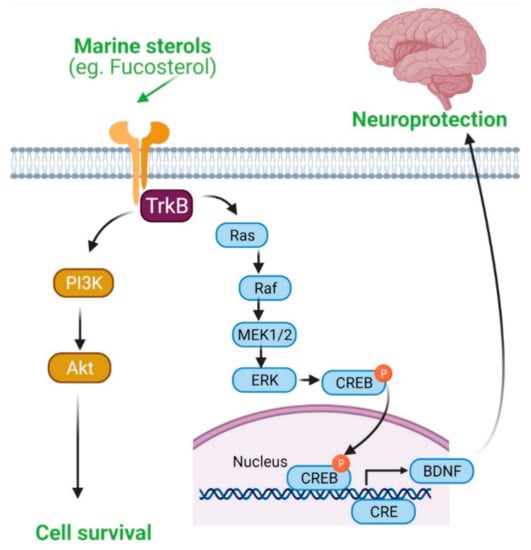Aβ aggregation initiates neuroinflammation and thereby can contribute to the pathobiology of AD. Marine sterols have been shown to protect against Aβ-induced cytotoxicity and clear Aβ in several studies. Fucosterol protected against Aβ1–42 (sAβ1–42)-mediated cytotoxicity and suppressed glucose-regulated protein 78 (GRP78) expression in cultured hippocampal neurons by upregulating tropomyosin receptor kinase B (TrkB)-mediated ERK1/2 signaling [] (Figure 4). These in vitro effects of fucosterol were further translated into an in vivo model, in which fucosterol co-treatment ameliorated sAβ1–42-induced cognitive impairment in aging rats through suppression of GRP78 expression and upregulation of BDNF expression in the dentate gyrus []. In Aβ-induced SH-SY5Y cells, fucosterol pretreatment attenuated neurotoxicity by upregulating neuroglobin (Ngb) mRNA expression []. Fucosterol preconditioning also decreased APP mRNA and lowered Aβ levels in activated SH-SY5Y cells []. Supplementation of astrocytes with 24(S)-saringosterol caused an increase in ApoE secretion. Furthermore, supplementation of microglia with conditioned medium of 24(S)-saringosterol-treated astrocytes augmented microglial clearance of Aβ1–42. 24(S)-saringosterol reduces Aβ42 release in APP overexpressing neuronal N2a cells []. 16-O-desmethylasporyergosterol-β-d-mannoside isolated from marine-derived fungus Dichotomomyces cejpii exhibited a moderate Aβ-42 lowering activity in APP-overexpressing aftin-5-treated N2a cells []. 4-methylenecholestane-3β,5α,6β,19-tetraol attenuated glutamate-induced neuronal injury, prevented N-methyl-D-aspartate (NMDA)-induced intracellular calcium increase, and inhibited NMDA currents, suggesting that this marine-derived sterol could also have therapeutic potential against glutamate excitotoxicity [].