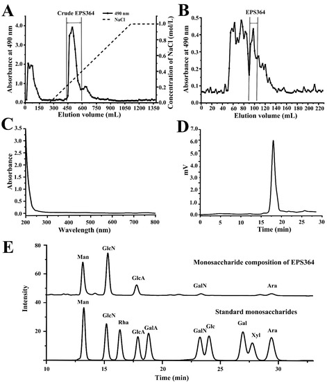 Purification and composition identification of EPS364. (A) The chromatograph profile of the crude polysaccharide EPS364 on a DEAE Sepharose Fast Flow column eluted with a linear gradient of NaCl aqueous solutions (0–1.0 M) at a flow rate of 2.0 mL/min. (B) The elution profile of EPS364 on a Sephadex G-100 column eluted with ultrapure water at a flow rate of 1.0 mL/min. (C) UV spectrum of EPS364 detected by a NanoPhotometer® spectrophotometer. (D) HPGPC (high-performance gel permeation chromatography) profile of EPS364. (E) The monosaccharide composition of EPS364. Abbreviations: Man, mannose; GlcN, glucosamine; Rha, rhamnose; GlcA, gluconic acid; GalA, galacturonic acid; GalN, galactosamine; Glc, glucose; Gal, galactose; Xyl, xylose and Ara, arabinose.