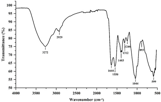 The FTIR spectrum analysis revealed distinctive chemical bands with typical absorption peaks [14]. Therefore, the FTIR spectrum analysis plays a vital role in the structural characterization analysis of polysaccharides. The FTIR spectrum of EPS364 is shown in Figure 2. The peaks at 3272 and 1043 cm−1 were attributed to the stretching vibrations of the O-H and C-O groups. The absorption peak at 2929 cm−1 was attributed to the stretching vibration of C-H [15]. The strong absorption peak near 1044 cm−1 was attributed to the C-O-C and C-O groups, which suggested the presence of a pyranose ring [14]. The absorption peaks at 1644 and 1403 cm−1 revealed the carboxylate groups of uronic acid residues [16]. The peak at 1312 cm−1 corresponded to C-H bending vibrations. In addition, the peak at around 1550 cm−1 corresponded to the carbonyl C=O stretching vibration and N-H bond [13,14]. Moreover, the absorption peak around 893 cm−1 corresponded to the β-linked glycosidic bond [13,16,17]. The absorption peak at 1246 cm−1 was caused by the P=O stretching vibration in the phosphate group [18]. These data suggest that EPS364 is a β-linked and phosphorylated polysaccharide.