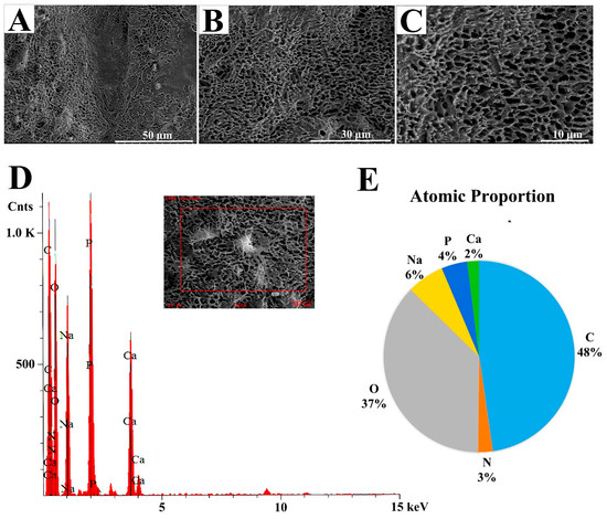Biomacromolecule surface morphology as an important characteristic is associated with the other physical properties of a polymer, such as the rheological behavior and water holding capability [19]. The surface morphology of EPS364 was visualized using SEM. As shown in Figure 3A–C, EPS364 exhibited a regular porous network structure. The porous network structure increases the viscosity and water holding capacity of the polysaccharide, making EPS364 more suitable for pharmaceutical applications [20].