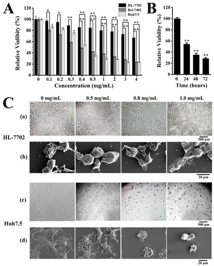 To investigate the therapeutic potential of EPS364, we detected its effects on human normal liver HL-7702 cells, liver cancer Bel-7402 cells and liver cancer Huh7.5 cells. As shown in Figure 4A, EPS364 preferentially killed cancer cells, including human liver cancer Bel-7402 cells and Huh7.5 cells, compared with human normal liver HL-7702 cells in a dose-dependent manner after treatment for 48 h. When the concentration was above 0.5 mg/mL, EPS364 better inhibited Huh7.5 cells. Therefore, we chose Huh7.5 cells as our model to investigate the molecular mechanism of EPS364. As shown in Figure 4B, the relative Huh7.5 cell viability decreased from 100% to 28.4% after EPS364 treatment (0.5 mg/mL) for different times (0–72 h). EPS364 inhibited the Huh7.5 cell growth in a time-dependent manner. According to Figure 4A,B, EPS364 exhibited significant antitumor activity in dose- and time-dependent manner.