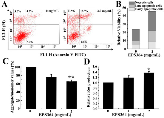 To investigate whether the growth inhibition effect was related to the induction of apoptosis, we performed the apoptosis analysis with high concentrations of EPS364 (0–2 mg/mL) for a short time (12 h). To observe the primal changes of the MMP and ROS, Huh7.5 cells were treated with high concentrations of EPS364 (0–2 mg/mL) for a short time (12 h). The results of the flow cytometry analysis (Figure 5A,B) showed that the apoptosis of Huh7.5 cells was remarkably induced after EPS364 treatment. Huh7.5 cells with EPS364 treatment resulted in increases of early apoptosis and late apoptosis, from 5.2% to 8.5% and 4.3% to 13.5%, respectively. These data indicated that cell apoptosis might contribute to the growth inhibition effect induced by EPS364.