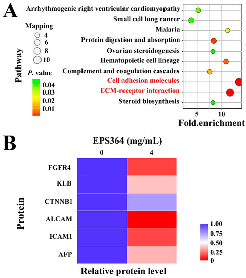 Proteomic analysis of Huh7.5 cells treated with EPS364 for 12 h. (A) KEGG (Kyoto Encyclopedia of Genes and Genomes) enrichment of the downregulated pathways in EPS364-treated cells. The cell adhesion molecules and extracellular matrix (ECM)-receptor interaction molecules were significantly downregulated in EPS364-treated cells. (B) Heatmap showing the representative proteins related to cancer cell growth, adhesion and the FGF19-FGFR4 signaling pathway that were downregulated in the EPS364-treated group. Abbreviations: FGFR4, fibroblast growth factor receptor 4; KLB, β-klotho; CTNNB1, β-catenin; ALCAM, activated leukocyte cell adhesion molecule; ICAM1, intercellular adhesion molecule 1 and AFP, α-fetoprotein.