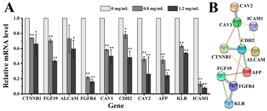 Expression and interaction assays of proteins that were significantly downregulated by the treatment of EPS364 for 5 h, as shown in the proteomic results. (A) The relative mRNA levels of different genes related to cancer cell growth, adhesion and the FGF19-FGFR4 signaling pathway were detected by qRT-PCR after different concentrations of the EPS364 (0–1.2 mg/mL) treatment. (B) The interactions of the cancer cell growth, adhesion and FGF19-FGFR4 signaling pathway-related proteins were analyzed by String software. Data are presented as means ± SD of three independent experiments (n = 3). * p < 0.05 and ** p < 0.01 versus the EPS364-treated group. Abbreviations: FGFR4, fibroblast growth factor receptor 4; KLB, β-klotho; CTNNB1, β-catenin; ALCAM, activated leukocyte cell adhesion molecule; ICAM1, intercellular adhesion molecule 1; AFP, α-fetoprotein; CAV1, caveolin-1; CAV2, caveolin-2; CDH2, N-cadherin and FGF19, fibroblast growth factor 19.