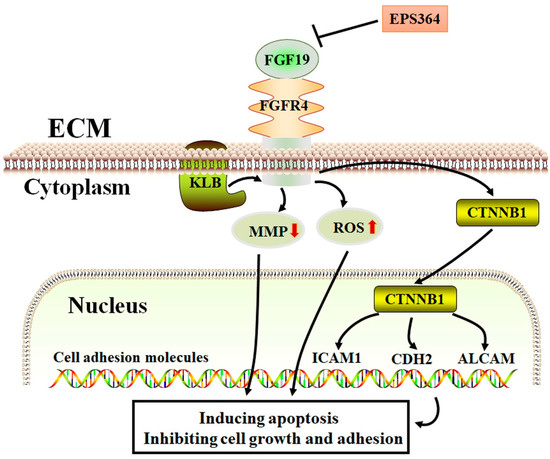 Therefore, we proposed a possible antitumor model of EPS364 (Figure 8). In this model, EPS364 downregulated the FGF19-FGFR4 signaling axis. The downregulation of FGF19-FGFR4 signaling induced the collapse of the MMP and the generation of ROS. Besides, the downregulation of the FGF19-FGFR4 signaling pathway was also transferred from CTNNB1 to inhibit the expression of cell adhesion molecule genes such as ICAM1, CDH2 and ALCAM. As a consequence, EPS364 inhibited the cancer cell growth and adhesion.