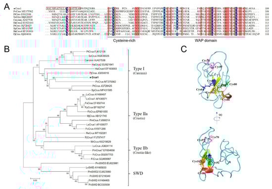 The deduced amino acid sequence of Crus1 contains 109 residues, with a calculated molecular weight of 12.05 kDa and a predicted pI of 7.82. Crus1 possesses a signal peptide in the N-terminus (residues 1 to 20) and a WAP domain in the C-terminus, in which a ‘four-disulfide core’ structure can be formed by C64–C93, C70–C97, C80–C92, and C86–C103. Protein BLAST showed that Crus1 shares the highest identity (51.76%) with PvCrus, a Type I crustin of Penaeus vannamei (GenBank accession No. MT375562). The sequence identity between Crus1 and Re-crustin, the Type II crustin identified in the shrimp from MAR [27], is 24.74%. The sequence alignment between Crus1 and representative Type I crustins indicated that the conserved WAP domain, in particular the 8 cysteines that form the four-disulfide core structure, was shared among the crustins (Figure 1A). In addition, four cysteines in the N-terminus (corresponding to C31, C35, C44, and C45 in Crus1) were also conserved among the Type I crustins (Figure 1A). Phylogenetic analysis showed that Crus1 was grouped into the clade of Type I crustin (Figure 1B). The predicted protein structure of Crus1 contains mostly random coils, with a very little amount of α-helix and β-pleated sheet (Figure 1C).
