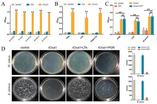 Binding of rCrus1 to bacteria and cell wall components. (A) Bacteria were incubated with rCrus1, recombinant Thioredoxin (rTrx), or phosphate buffer saline (PBS) (control), and the bound rCrus1 was detected by ELISA. (B) PGN and LTA were incubated with rCrus1, rTrx, or PBS, and the bound rCrus1 was detected as above. (C) PGN, LTA, and Bacillus cereus were incubated with or without (control) rCrus1, DTT-treated rCrus1, or DTT, and the bound rCrus1 was detected as above. Values are shown as means ± SD (N = 3). N, the number of replicates. ** p < 0.01, * p < 0.05, NS, not significant (Student’s t test). (D) Micrococcus luteus and B. cereus were treated with or without (control) rCrus1, rCrus1 plus PGN, or rCrus1 plus LTA for 1 h. The bacteria were plated on LB plates and observed after 20–24 h incubation. The number of colony-forming units (CFU) was determined and shown on the right panels.