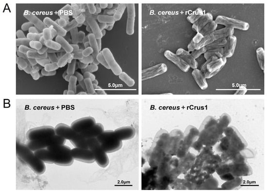 Morphological changes of the bacterial cells treated with rCrus1. Bacillus cereus was incubated with rCrus1 or PBS for 2 h, and the bacterial cells were inspected with a scanning (A) or transmission (B) electron microscope.