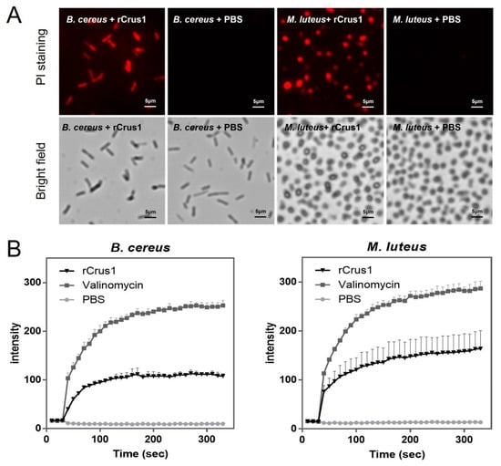 The effect of rCrus1 on bacterial cell membrane integrity. (A) Bacillus cereus and Micrococcus luteus were incubated with rCrus1 or PBS for 2 h. The cells were stained with PI and observed for PI uptake (upper panels) with a fluorescence microscope. The bright field image is shown in the lower panels. (B) B. cereus and M. luteus were pre-incubated with DiSC3(5) and then treated with rCrus1, valinomycin, or PBS, and the fluorescence of the cells was subsequently determined.