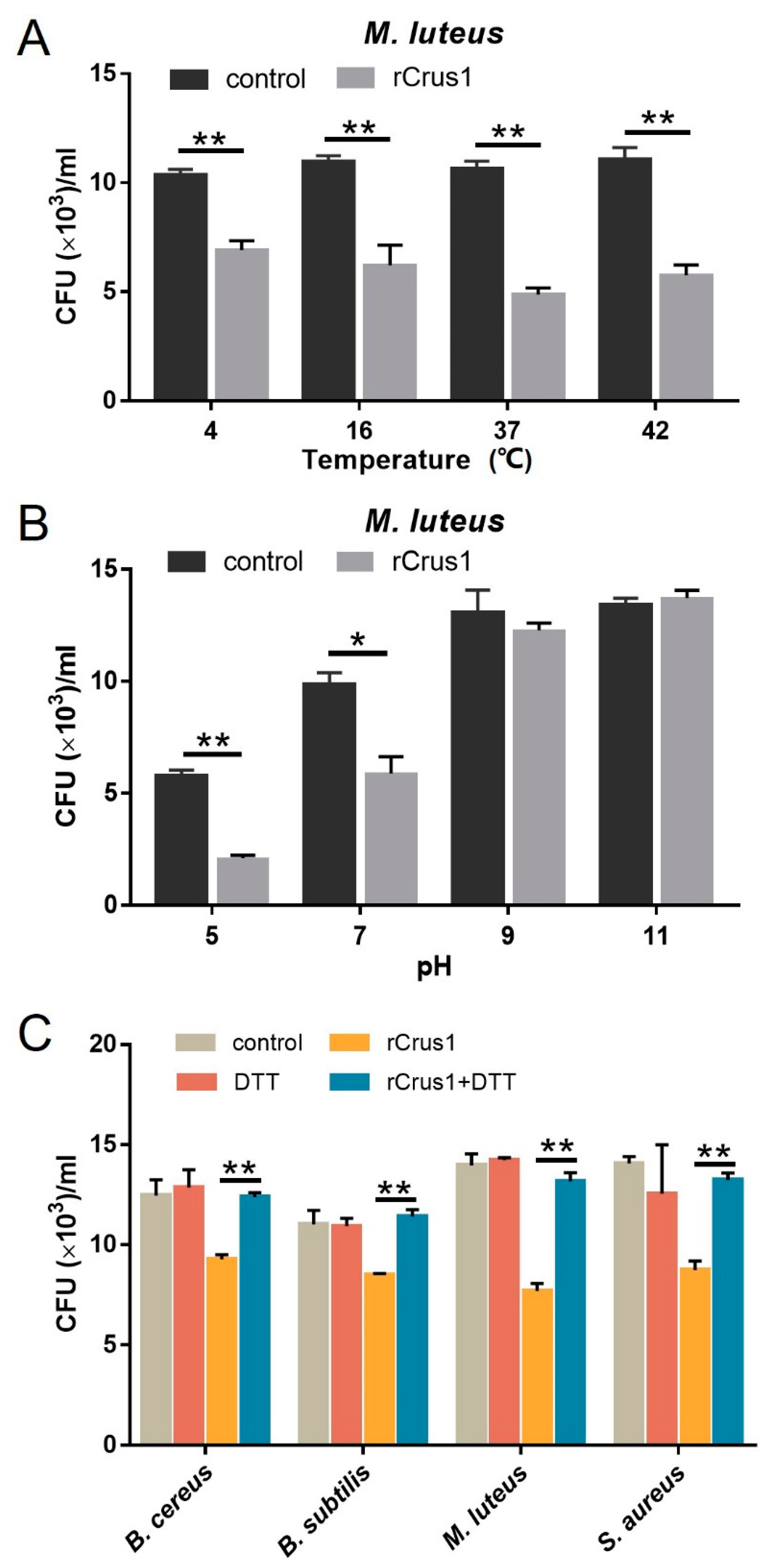 Effect of temperature, pH and disulfide bond on the antibacterial activity of rCrus1. (A) Micrococcus luteus was incubated with or without (control) rCrus1 (2.5 µM) at various temperatures for 2 h, and bacterial survival was determined by plate count. (B) M. luteus was incubated with or without (control) rCrus1 (2.5 µM) at various pH for 2 h, and bacterial survival was determined as above. (C) Bacteria were incubated with or without (control) rCrus1 (2.5 µM), DTT-treated rCrus1 (2.5 µM), or DTT for 2 h, and bacterial survival was determined as above. Values are shown as means ± SD (N = 3). N, the number of replicates. ** p < 0.01, * p < 0.05 (Student’s t test).