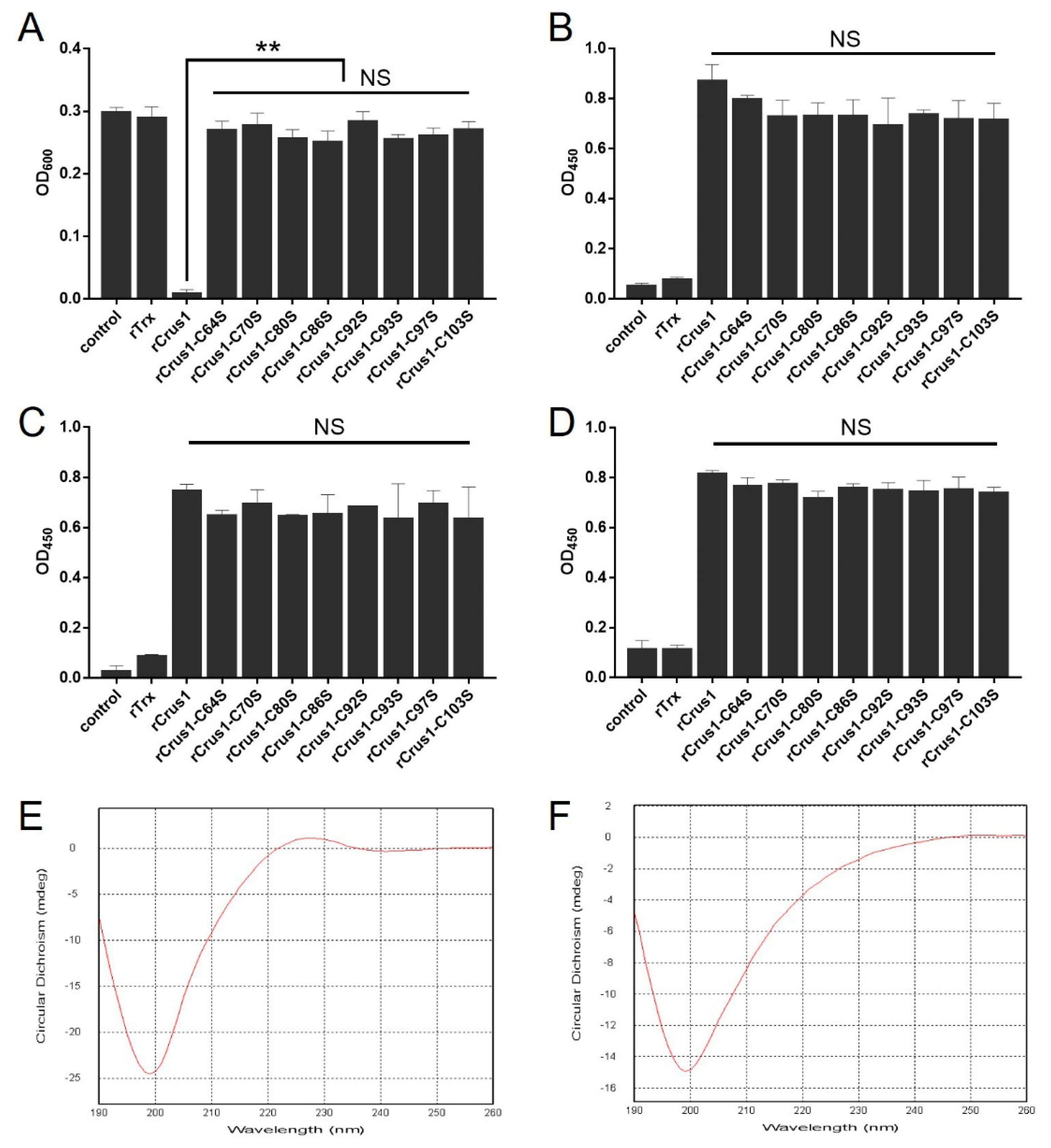 To evaluate the functional importance of the conserved cysteine residues in the WAP domain, the eight Cys residues in this domain were mutated individually to Ser. The bactericidal activities of the resulting mutants, i.e., rCrus1-C64S, rCrus1-C70S, rCrus1-C80S, rCrus1-C86S, rCrus1-C92S, rCrus1-C93S, rCrus1-C97S, and rCrus1-C103S, were examined. None of the mutants exhibited apparent bactericidal activity at the MBC of rCrus1 (Table S1), or inhibited the growth of M. luteus even at the high concentration of 8 × MIC of rCrus1 (Figure 6A). However, all mutants were still able to bind to bacteria and bacterial cell wall components in a manner comparable to that of rCrus1 (Figure 6B–D). To examine whether the mutation changed the structure of rCrus1, the secondary structures of rCrus1 and rCrus1-C103S were subjected to circular dichroism (CD) analysis. Both rCrus1 and rCrus1-C103S showed a CD profile indicative of the formation of random coil structure; however, a fraction of the random coil differed slightly between rCrus1 and rCrus1-C103S (Figure 6E,F).