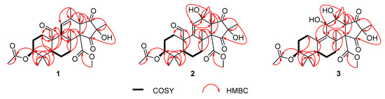 Key correlation spectroscopy (COSY) correlations and heteronuclear multiple bond correlations (HMBC) of 1–3.
