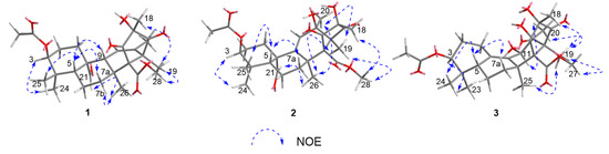 Key nuclear overhauser effect spectroscopy (NOESY) correlations of 1–3.