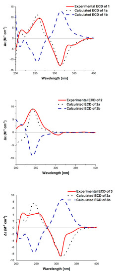Conformational analyses for compounds 1–3 were performed using Maestro 10.2 in the OPLS3 molecular mechanics force-field within an energy window of 5.0 or 3.0 kcal/mol. The conformers were then further optimized with the software package Gaussian 09 at the B3LYP/6-311G(2d,p), B3LYP/6-31G(d), and B3LYP/6-311G(d,p) level for compounds 1–3, respectively [24], and the harmonic vibrational frequencies were also calculated to confirm their stability. The time-dependent density functional theory (TD-DFT) methods at the CAM-B3LYP/6-31G(2d,p), B3LYP/6-31G(d), and B3LYP/6-311G(d,p) were applied to calculate the 60 lowest electronic transitions which obtained conformers in vacuum, respectively. The Gaussian function was applied to simulate the ECD spectrum of the conformers. The calculated ECD spectra were obtained according to the Boltzmann weighting of each conformer’s ECD spectrum in MeOH solution.