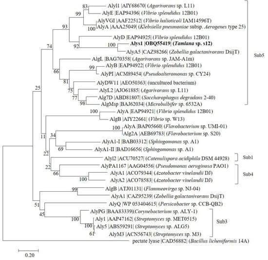 For functional annotation of the predicted proteins, similarity searches of amino acid sequences were performed using the BLAST algorithm on the National Center for Biotechnology Information server (NCBI) (http://www.ncbi.nlm.nih.gov, accessed on 2 August 2020). Molecular weights of the putative proteins were estimated using the peptide mass tool on the ExPASy server of the Swiss Institute of Bioinformatics (http://swissmodel.expasy.org/, accessed on 2 August 2020). The theoretical pI of Alys1 were calculated with the compute pI Tool (https://web.expasy.org/compute_pi/, accessed on 2 August 2020). The signal peptide cleavage site of Alys1 was predicted through the SignalP 5.0 server (http://www.cbs.dtu.dk/services/SignalP/, accessed on 2 August 2020). Protein modules and domains were identified in the products using the Simple Modular Architecture Research Tool (https://en.wikipedia.org/wiki/Simple, accessed on 2 August 2020 Modular Architecture Research Tool), the Pfam database (http://pfam.xfam.org, accessed on 2 August 2020), the CAZy database (http://www.cazy.org, accessed on 2 August 2020), and the NCBI Conserved Domain Database (CDD) []. Multiple sequence alignments were carried out using DNAMAN version 9.0 (Lynnon biosoft, San Ramon, CA, USA). Phylogenetic analyses were performed using MEGA version 7.0 [].