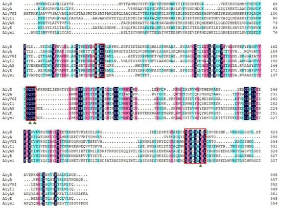 Multiple sequence alignments of alginate lyase Alys1 and related alginate lyases of the PL7 family. Alys1 (OBQ55419) from Tamlana sp. s12 in this study, AlyD (EAP94925) from Vibrio splendidus 12B01, AlyA (AAA25049) from Klebsiella pneumoniae subsp. Aerogenes type 25, AlyVGI (AAF22512) from Vibrio halioticoli IAM14596T, Alyl1 (AIY68670) from Agarivorans sp. L11, AlyA5 (CAZ98266) from Zobellia galactanivorans DsiJT, AlyE (EAP94396) from Vibrio splendidus 12B01. The conserved amino acid regions are highlighted with red boxes. The potential residues involved in the catalytic activity in the PL7 family are indicated with green triangles.
