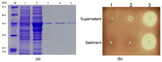 To rapidly and sensitively identify the activity of the alginate lyase, the plate assay of Gram’s iodine was improved []. The 0.9% agarose gel containing 1.0% alginate was flooded with a four-fold diluted solution of Gram’s iodine after 3 h incubation of alginate lyase at 35 °C. A clearance zone around the alginate lyase was distinct within 1–2 min after flooding the agarose gel.
