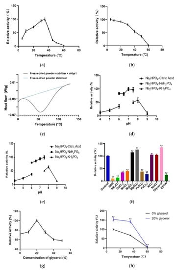 The biochemical characteristics of alginate lyase rAlys1. (a) The optimal temperature of alginate lyase rAlys1; (b) the thermal stability of alginate lyase rAlys1; (c) the melting temperature (Tm) of rAlys1. Black line, the purified rAlys1 with 10 mM freeze-dried powder stabilizer; blue line, 10 mM freeze-dried powder stabilizer; (d) the optimal pH of alginate lyase rAlys1 in 20 mM Na2HPO4–Citric acid buffer (filled circle), 20 mM Na2HPO4–NaH2PO4 buffer (filled square), or 20 mM Na2HPO4–KH2PO4 buffer (filled triangle); (e) the pH stability of the alginate lyase rAlys1 in 20 mM Na2HPO4–Citric acid buffer (filled circle), 20 mM Na2HPO4–NaH2PO4 buffer (filled square), or 20 mM Na2HPO4–KH2PO4 buffer (filled triangle); (f) the effect of different metal ions, EDTA, Glycerol and SDS on Alys1, ** denote the significant differences (p < 0.01) from the control; (g) the optimal glycerol concentration of rAlys1; (h) the thermal stability of alginate lyase rAlys1 in glycerol, ** denote the significant differences (p < 0.01) from the 0% glycerol.