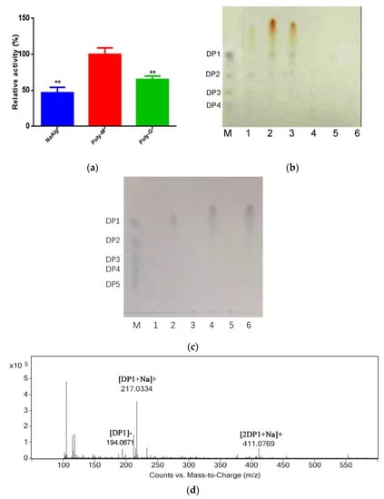 The substrate specificity and final products of alginate lyase rAlys1. (a) Relative enzyme activities of rAlys1 a toward alginate, polyM, and polyG, ** denote the significant differences (p < 0.01) from the poly-M. (b) TLC analysis of the degradation products of alginate lyase rAlys1 toward alginate, polyM, and polyG for 0.5 h. Column M, reference standards; column 1, products of alginate sodium; column 2, products of Poly-M; column 3, products of Poly-G; columns 4–6, culture medium containing 0.2% alginate sodium, Poly-M and Poly-G. (c) TLC analysis of the degradation products of alginate lyase rAlys1 toward alginate, polyG, and polyM for 12 h. Column M, reference standards; columns 1, culture medium containing 0.2% alginate sodium; column 2, products of alginate sodium; columns 3, culture medium containing 0.2% Poly-G; column 4, products of Poly-G; column 5, culture medium containing 0.2% Poly-M; column 6, products of Poly-M. (d) LC-MS analysis of the degradation products of alginate lyase rAlys1 toward alginate for 12 h.