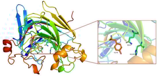 The three-dimensional structure of Alys1 without a signal peptide was constructed using SWISS-MODEL [] on the basis of homologs of known structure (AlyA5, PDB ID: 4BE3) with sequence identity of 76%. Alys1 is predicted to have the same jelly roll-fold and additional loops as AlyA5 []. The key residues for catalytic activity were predicted to be residues Q127, H129, and Y279 (Figure 6). Mutation of these residues were purified (Figure S2) and had no enzyme activity.