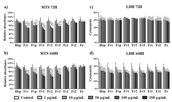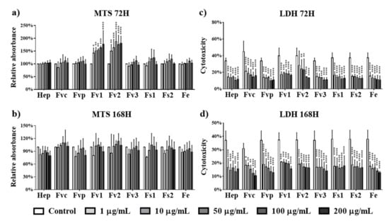 Cell metabolic activity of mesenchymal stem cells (MSCs) determined by MTS assay at (a) 72 h and (b) 168 h and cytotoxicity for MSCs determined by LDH at (c) 72 h and (d) 168 h after treated with fucoidan extracts and heparin at different concentrations of 1, 10, 50, 100, and 200 µg/mL. Two-way ANOVA, * p < 0.05, ** p < 0.01, *** p < 0.001, **** p < 0.0001, n = 3.