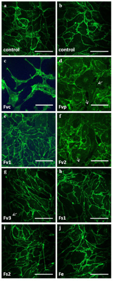Confocal laser scanning microscopy of OEC mono-cultures on day 7 for (a,b) controls and treatment of 100 μg/mL fucoidan extracts: (c) Fvc, (d) Fvp, (e) Fv1, (f) Fv2, (g) Fv3, (h) Fs1, (i) Fs2 and (j) Fe. VE-cadherin is depicted in green. The scale bar represents 100 μm.