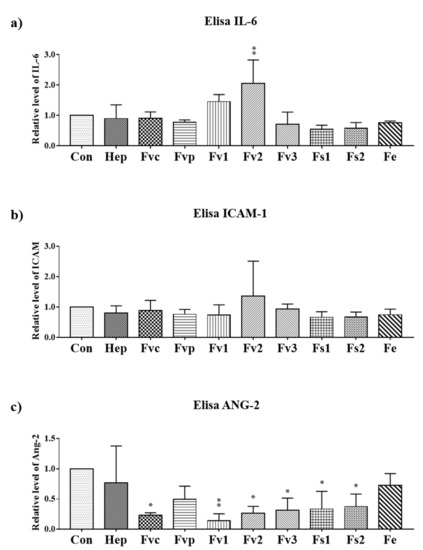 To study the impact of fucoidan extracts (100 µg/mL) on inflammatory and angiogenic endothelial cell activation [19,20], the secretion of associated inflammatory mediators (interleukin-6 IL-6 and intracellular adhesion molecule-1(ICAM-1)) and the proangiogenic molecule ANG-2 produced by endothelial cells [21] was determined by ELISA (Figure 4a–c). In addition, we performed real-time PCR for gene expression of IL-6, ICAM-1, and vascular cells adhesion molecule-1 (VCAM-1) (Figure S3) but we focus here on the protein level due to the higher physiological relevance. For protein assessment, all samples were harvested after seven days. Only Fv2 treatment resulted in a significant increase of IL-6 compared with the control, indicating an inflammatory reaction of the endothelial cells by Fv2, which was further underlined by a tentative increase in soluble ICAM-1. A similar but not significant increase of IL-6 was observed for Fv1. Further, the results indicate a significant reduction of angiopoietin 2 (ANG-2) for most extracts except for Fvp and Fe, indicating a reduction of this proangiogenic molecule produced by endothelial cells.