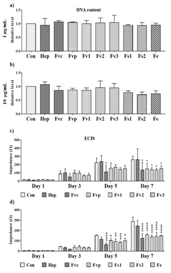Effect of fucoidan on cell proliferation depicting the DNA content of MSC mono-cultures at (a) 1 and (b) 10 µg/mL fucoidan/heparin treatment and (c,d) impedance measurement for MSC (seeded at a density of 5000 cells/cm2) detected by ECIS at 100 µg/mL treatment. One-way ANOVA, * p < 0.05, ** p < 0.01, *** p < 0.001, **** p < 0.0001, n = 3.
