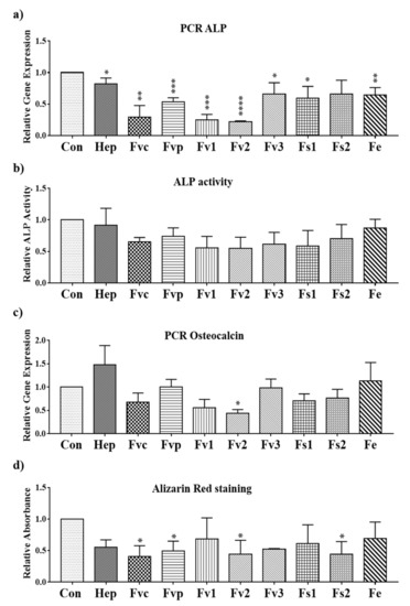As shown in Figure 7d, the calcification level determined by Alizarin Red staining showed a significant reduction when MSCs were treated with Fvc, Fvp, Fv2, and Fs2. Other extracts had a similar but not significant effect on the calcification level, and results reflected widely data by PCR for osteocalcin (Figure 7c).