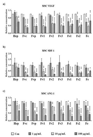 The relative amount of angiogenic growth factors: (a) vascular endothelial growth factor (VEGF), (b) stromal derived factor-1 (SDF-1), and (c) angiopoietin 1 (ANG-1) in supernatant of MSC mono-cultures treated with 100 µg/mL fucoidan/heparin on day 7, measured with enzyme-linked immunosorbent assay. One-way ANOVA, * p < 0.05, ** p < 0.01, *** p < 0.001, **** p < 0.0001, n = 3.