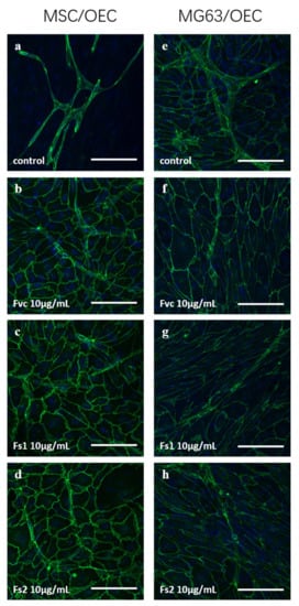 Confocal laser scanning microscopy for: MSC/OEC co-cultures on day 7 for control (a) and 10 µg/mL treatment of Fvc (b), Fs1 (c), and Fs2 (d); MG63/OEC co-cultures on day 7 for control (e) and 10 µg/mL treatment of Fvc (f), Fs1 (g), and Fs2 (h). Endothelial marker VE-cadherin is depicted in green, and nuclei are depicted in blue. The scale bar represents 100 μm.