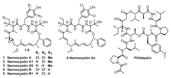 Nannocystin A (1) and its natural congener (2–6) (Figure 1) are myxobacterial secondary metabolites isolated by Hoepfner [7] and BrÖnstrup [8] independently from Nannocystis sp. They exhibit significant inhibitory activity against a broad variety of human cancer cells at nanomolar concentrations [7,8]. This anti-neoplastic activity is attributed to the binding affinity with elongation factor 1A (eEF1A) [7]. Since this mechanism is shared by plitidepsin [9,10] (isolated from the marine tunicate Aplidium albicans, Figure 1) which has recently been approved by the Australia Therapeutic Goods Administration for clinical use against multiple myeloma, it is obvious that nannocystins might be a promising lead for anti-cancer drug discovery.