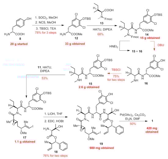 In our previous paper [13], we provided a concise route in 10 steps (longest linear sequence) featuring an intramolecular Heck cross-coupling for the final macrocyclization. Connections of building blocks (7–11, Figure 2) via well-established esterification, amidation and the Mitsunobu reaction succeeded in providing the penultimate linear precursor 19 (Figure 3). Considering that five chiral centers (C2, C3, C5, C10, C11) were built on our own and the other four were innate in commercially available amino acid-derived starting materials, we paid key attention to these five chiral centers during the amplification process.