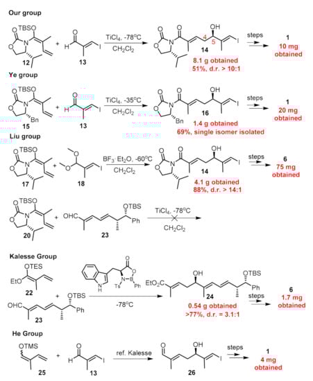 As for the establishment of the C5 chiral center, all seven reported synthetic routes deployed nucleophilic attack of carbon anions towards carbonyl groups, five of which including us employed an asymmetric vinylous Mukaiyama-type aldol reaction (Figure 4). Kobayashi et al. [25] first developed this type aldol reaction of an aldehyde with vinylketene silyl N,O-acetal, and the enantio-selectivity was controlled by the remote Evans auxiliary. By employing this methodology, we produced 14 (Figure 4) in an acceptable yield with a d.r. value > 10:1, and 8.1 g of product 14 was obtained for the previous batch. However, when we reperformed this reaction, we found it was capricious because upon scale-up to 5 g, the yield dropped considerably to 10%. Strictly following the previous operation, we repeated this reaction several times; the yield can occasionally reach up to 50% but it was unreproducible. In most cases, the yield ranged from 5% to 20%. Then, we carefully checked the details of this reaction such as the purity of reactants and solvent, the equivalents and concentrations of reactants, the reaction time and temperature, the stirring speed, the method of quench, etc., but still failed in furnishing 14 in a stable yield more than 20%. Meanwhile, Liu et al. [20] also reported the fruitlessness during the synthesis of nannocystin Ax utilizing 20 and aldehyde 23 (Figure 4). They found both reactants decomposed rapidly under treatment with Lewis acid such as TiCl4. In addition, considering the potential hazards of TiCl4 in the amplification process, we set out for an alternative method to achieve this transformation.
