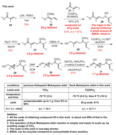 Ti(OiPr)4 is a mild reagent compared to TiCl4, and its combination with BINOL can also mediate the asymmetric Mukaiyama-type aldol reaction between aldehyde and vinylketene silyl acetal [26]. By employing the chiral BINOL reagents, this reaction can proceed in an enantio-selective manner with high e.e. value evidenced by our recent synthetic work of ovatodiolide [27]. Besides, the external addition of BINOL can save the installation and removal of auxiliaries on reactants compared to Evans auxiliary methodology, and BINOL can be recovered after the reaction is completed. Then, we chose economical material 24 (Figure 5) to form 25 as the coupling partner on a milligram scale. The reaction between aldehyde 21 and 25 with the addition of Ti(OiPr)4 and (R)-BINOL went smoothly to provide 26 in a stable >55% yield with an e.e. value = 85% [13]. The temperature was maintained at −78 °C only for 30 min after the reaction began and was allowed to warm to 0oC for another 10 h stirring. By far, the biggest batch we preformed was 20 g for compound 21 without any erosion of yield (for a complete comparison between two vinylous Mukaiyama aldol reactions, see Figure 5). Since the two produced enantiomers could not be easily separated, purification was deferred to later steps. Compound 26 was then converted to 27 under treatment with Ag2O and CH3I. The reduction of the methyl ester group with DIBAL-H afforded us 3.6 g of allylic alcohol 28. With the aid of Sharpless’ conditions, epoxidation proceeded stereoselectively and we obtained 29 as a mixture of two diastereomers. Next, building block 11 was obtained via two successive oxidations on a gram scale according to previous procedures. The compound with an undesired configuration at C5 disappeared after condensation with amine 15 according to the 1H-NMR of isolated product 17.