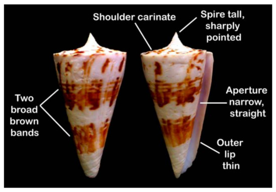 - Franklin, J.B.; Subramanian, K.; Fernando, S.A.; Krishnan, K. Diversity and distribution of conidae from the TamilNadu coast of India (Mollusca: Caenogastropoda: Conidae). Zootaxa 2009, 2250, 1–63. [Google Scholar] [CrossRef]