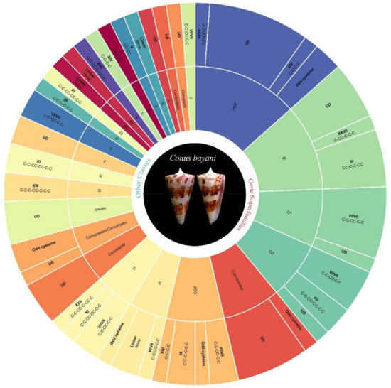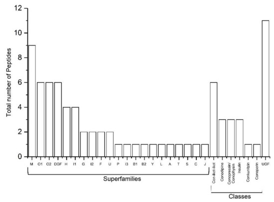 Graphical representation of the total number of peptides identified from C. bayani venom duct transcriptome analysis as classified under different conotoxin classes and cysteine patterns. UGF—unassigned gene family; DGF—divergent gene family.