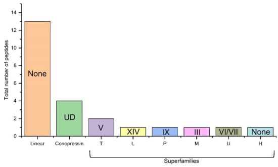 Total number of peptides identified as different conotoxin superfamilies using mass spectrometry analyses. UD—Undefined, None—No or absence of ‘Cys’ pattern, V, XIV, IX, III, VI/VII—Cysteine pattern.