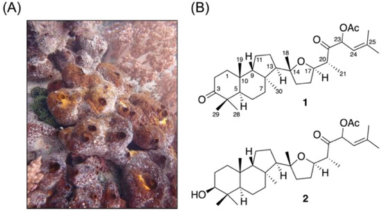 (A) Aquatic ecology of the sponge Rhabdastrella sp. and (B) the isolated isomalabaricane triterpenes.