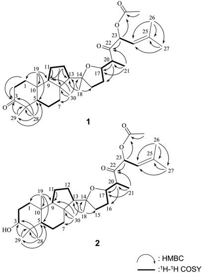 Selected 1H-1H COSY and HMBC correlations of 1 and 2.