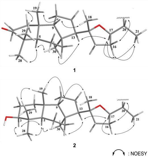Since all naturally occurring isomalabaricanes displayed that H-5 is trans to Me-19, we assumed the β-orientation of H3-19. Thus, H3-18 and H-9 were suggested to be positioned on the β-face. One of the methyl groups (H3-29) at C-4, which showed a NOE correlation with H3-19, was β-oriented and the other one (H3-28) was α-oriented. The NOE correlations observed between H3-28/H-5, H-5/H3-30, H3-30/H-13, H-13/H-17, H-17/H3-21, and H-17/H-16 suggested α-orientation of H-5, H-13, H-17, H3-21, and H3-30. One of the methylene protons at C-16 (δH 1.97), which showed a NOE correlation with H-17 and H3-21, was assigned as H-16α and the other one (δH 1.58) as H-16β. Moreover, the detection of large proton coupling constants at H-17 (J = 13.5 Hz) and H-20 (J = 13.5 Hz) further supported their trans conformation in between. The observed NOE correlation between H-20 and H-16β suggested a β-orientation of H-20.